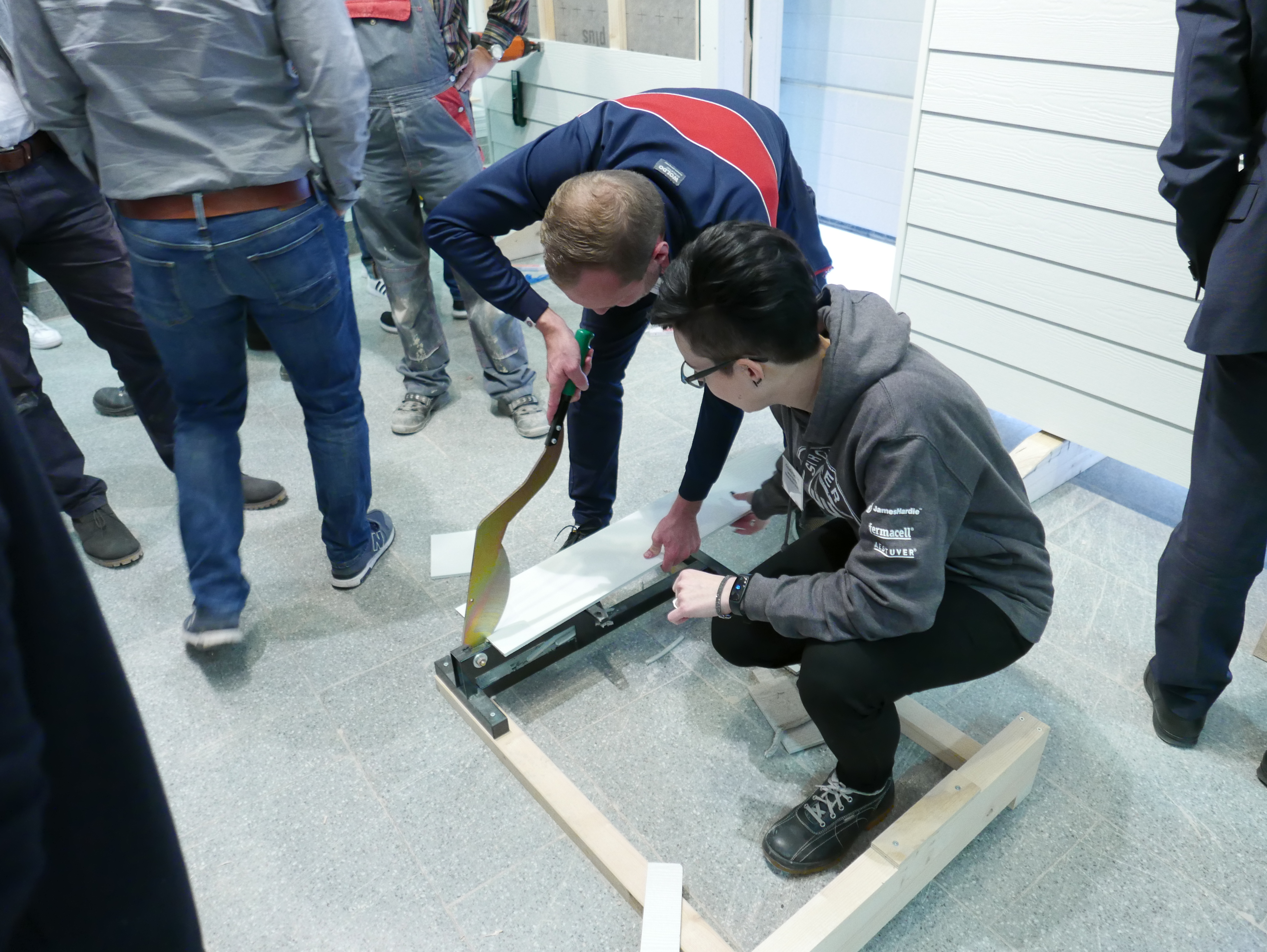 Hier erklärt Claudia Sefrin, James Hardie Europe, den Zuschnitt mit dem HardieGuillotine Schneidwerkzeug Bildnachweis: James Hardie Europe [5,51 MB]