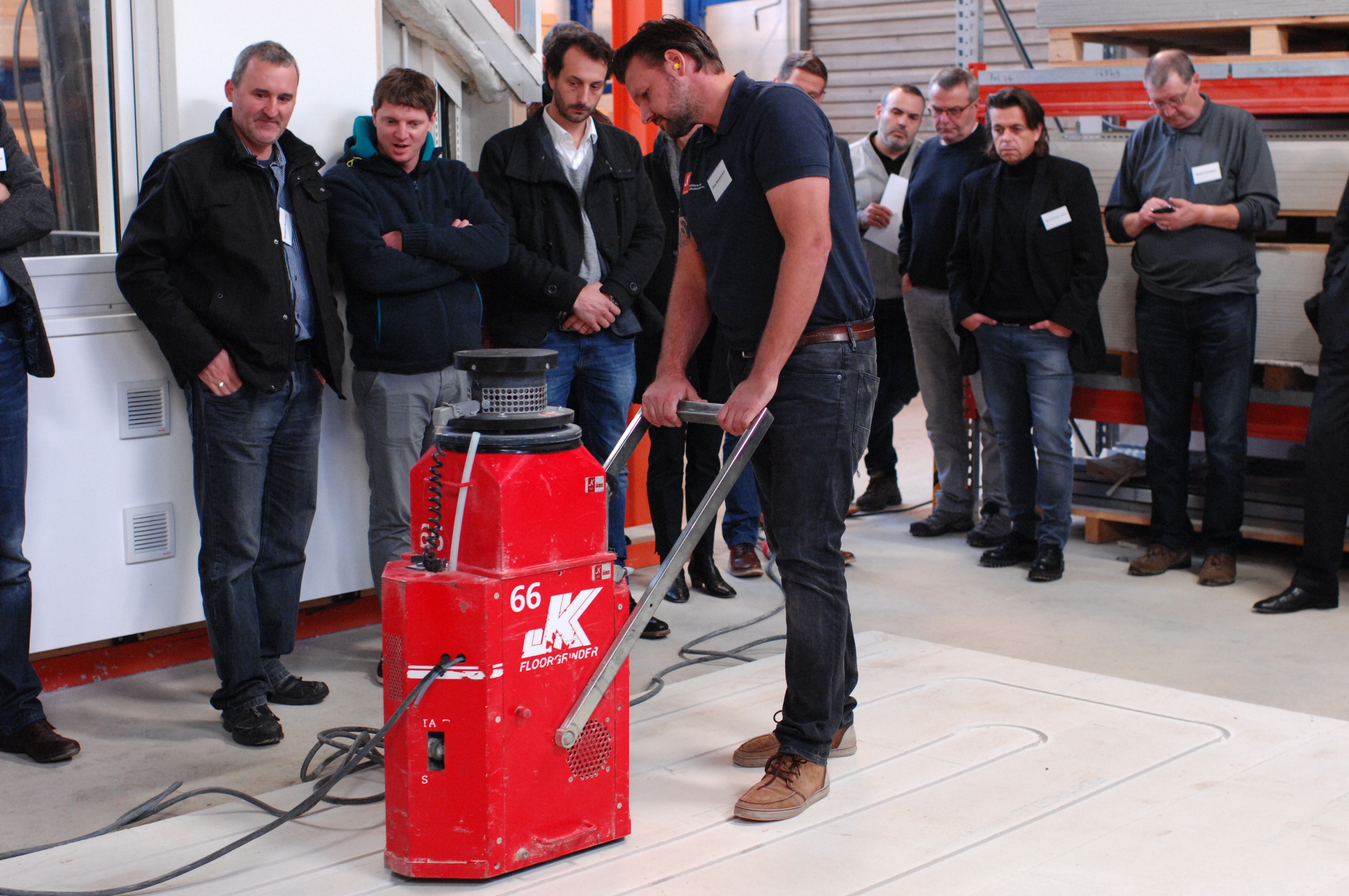 Die JK Fußbodenheizung GmbH präsentierte ein spezielles Verfahren, um in den vorhandenen Estrich Nuten für die Verlegung von Heizrohren für die Fußbodenheizung zu fräsen. [1,12 MB]