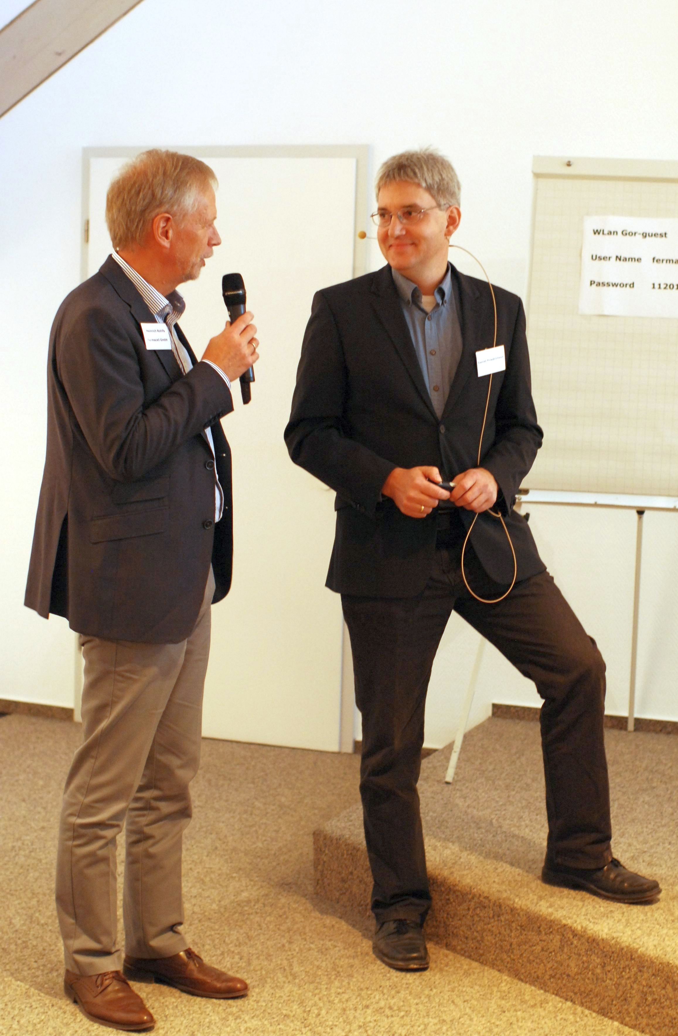 Dipl.-Ing. Jens Morscheid (links) und Dipl.-Ing. Dirk Lindner von der Fermacell GmbH erklärten, wie Fehler durch Überlegungen vor der Ausführung verhindert werden können und boten Hinweise auf Details und bauliche Voraussetzungen. [422,91 KB]