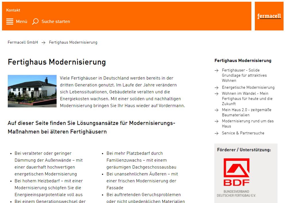 Die derzeit einzige Plattform mit gebündelten Informationen rund um die Fertighausrenovierung: Unter www.fermacell.de/fertighaus finden Besitzer von Fertighäusern, aber auch für Planer, holzverarbeitende Betriebe und Trockenbauer gebündelte Informatio [112,60 KB]