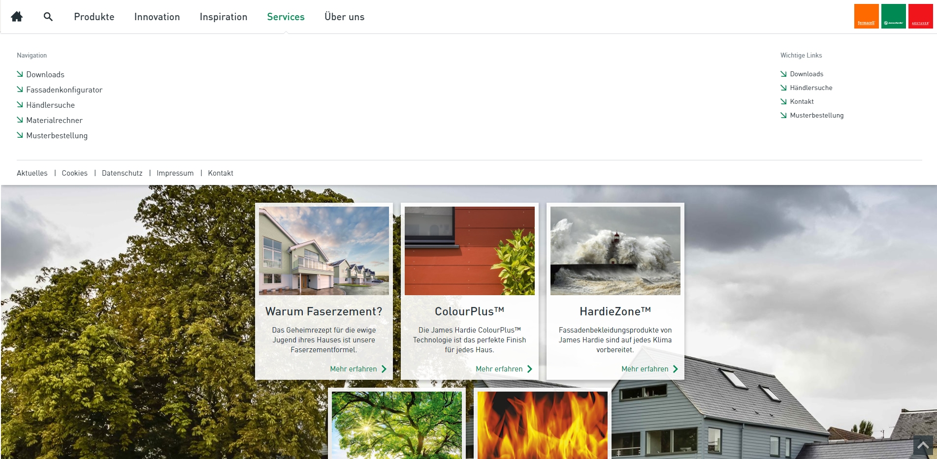 Eine Änderung, die bereits auf allen Webseiten der James Hardie Europe GmbH präsent ist, ist der Home Button oben links in der Menüleiste. Dieser kann zusätzlich zu den Logos oben rechts genutzt werden, um auf die Startseite zurückzukehren.