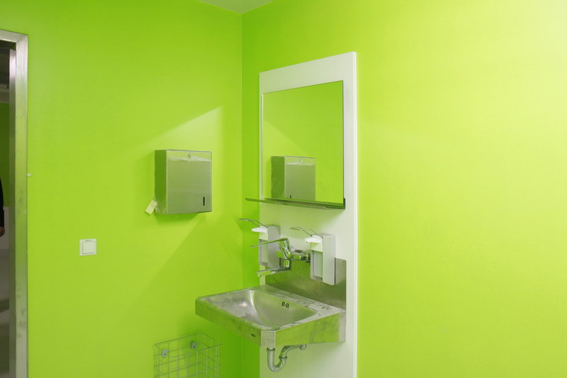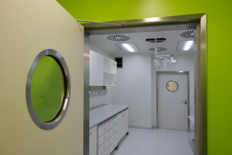 Bei der Planung berücksichtigt werden musste außerdem eine Trennung zwischen septischen und aseptischen Bereichen. Dies wurde neben entsprechenden baulichen Maßnahmen auch durch optische Maßnahmen realisiert. So steht eine Wandgestaltung in kräftigem Grünton für den aseptischen Bereich. Mit Rot werden die unreinen Bereiche gekennzeichnet. „Die Farbgebung,“ so Baurat Peter Krauße vom Staatlichen Bauamt Regensburg, „ist ein indirektes Wegeleitsystem. Gleichzeitig soll es aber auch ein bisschen Arbeitsstimmung mitbringen.“