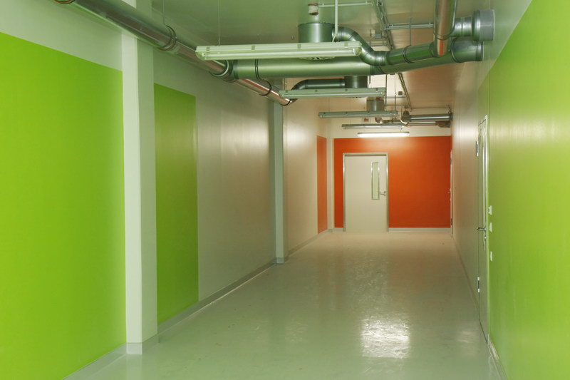 Der Innenausbau des Gebäudes erfolgte komplett in Trockenbauweise. Während dabei in den oberen Bereichen des Gebäudes Gipskartonplatten eingesetzt wurden, gestaltete sich die Wahl des Baustoffs für den Ausbau der septischen und aseptischen Bereiche schwieriger. Da speziell im Bereich der Tierhaltung viel mit Wasser gearbeitet wird und die Wände außerdem den Anforderungen eines Hochdruckreinigers standhalten müssen, war hier ein hochfeuchtigkeitsbeständiges Material gefordert.