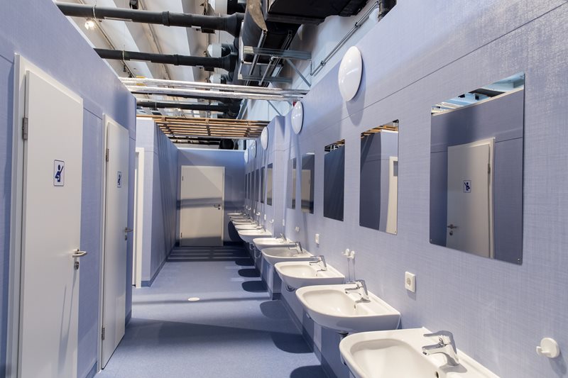 Der Umbau der denkmalgeschützten alten Stadthalle in Freiburg zu einer Flüchtlingsunterkunft stand unter hohem Zeitdruck. Entsprechend wurden Lösungen realisiert, die kurze Bauzeiten garantieren, gleichzeitig jedoch mit dem Denkmalschutz vereinbar sind. Der Umbau erfolgte daher in Trockenbauweise. Der gesamte Nassbereich wurde mit zementgebundenen Bauplatten ausgeführt, die wasserfest und widerstandsfähig gegen Chemikalien oder Desinfektionsmittel sind.